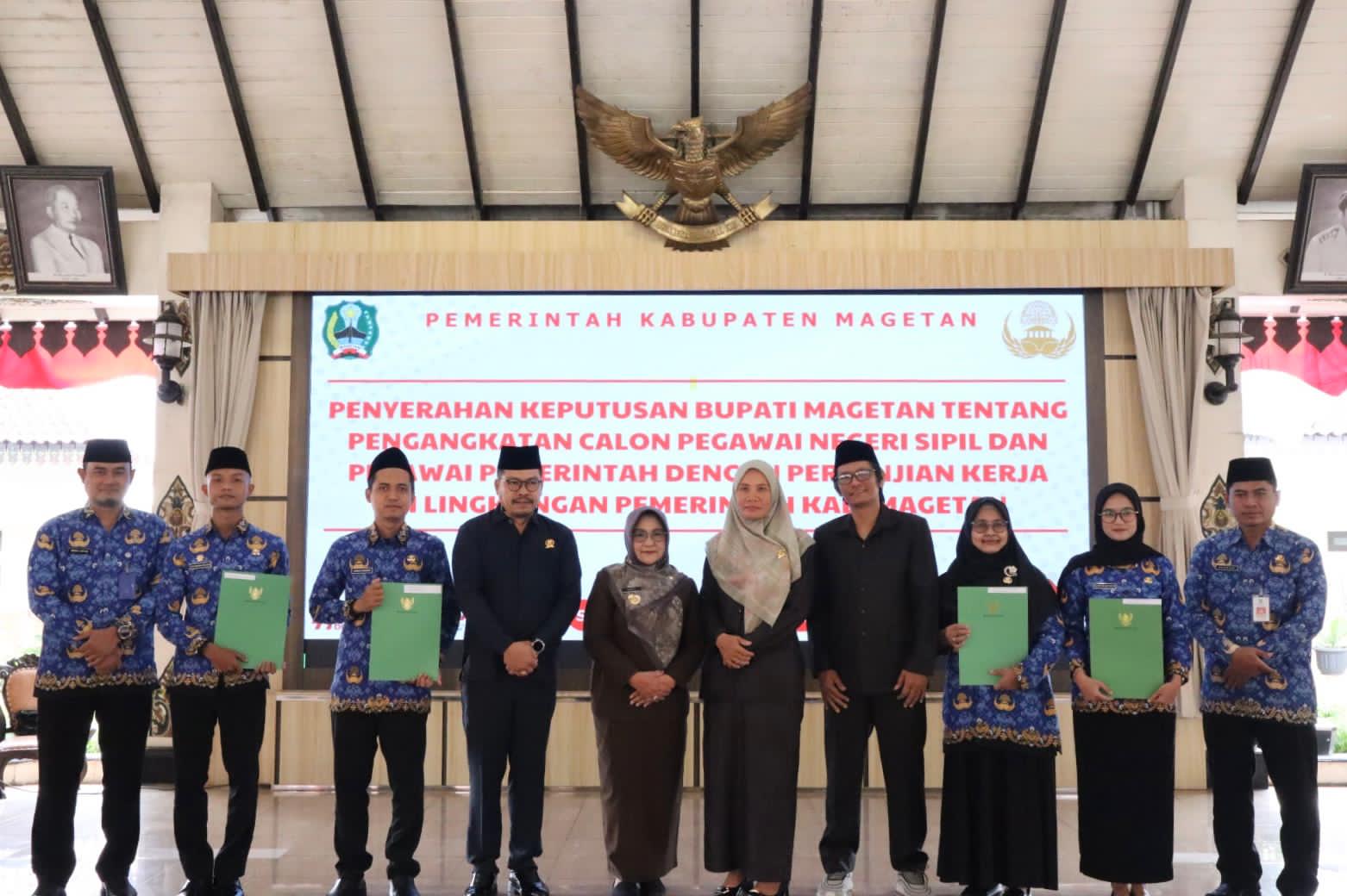 Beritatrends,Magetan – Sebanyak 192 Aparatur Sipil Negara (ASN) baru di Kabupaten Magetan resmi menerima Surat Keputusan (SK) pengangkatan Calon Pegawai Negeri Sipil (CPNS) dan Pegawai Pemerintah dengan Perjanjian Kerja (PPPK) formasi 2024 di Pendopo Surya Graha, Selasa (30/9/2025).