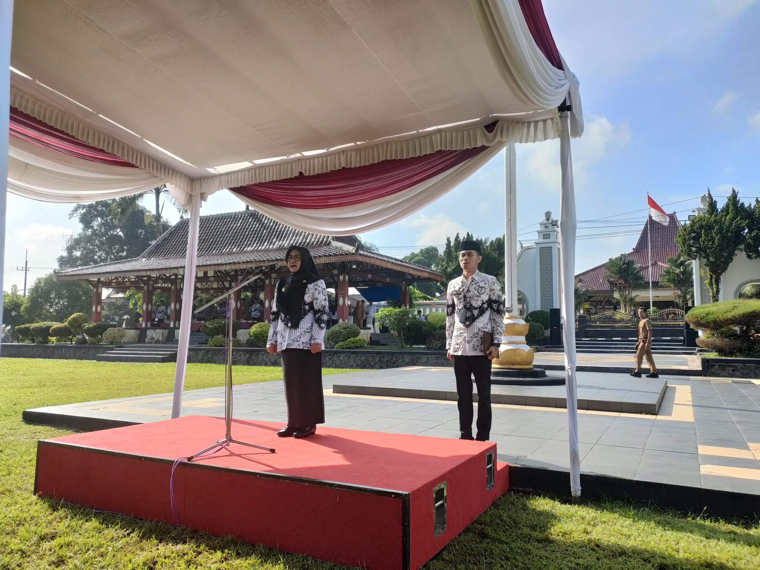 Bupati Magetan Nanik Sumantri M.Pd bertindak sebagai inspektur Upacara dan Para guru/Anggota PGRI sebagai peserta Upacara HUT-80 PGRI.
