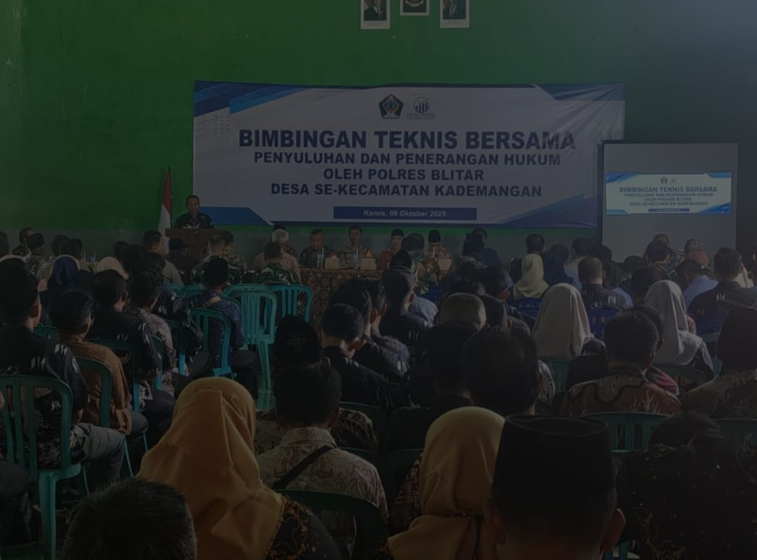 BeritaTrends, Blitar – Seluruh wilayah desa di Kecamatan Kademangan mengikuti kegiatan Bimbingan Teknis Bersama Penyuluhan dan Penerangan Hukum oleh Polres Blitar di Gedung Serba Guna Desa Suruhwadang, Kecamatan Kademangan, Kabupaten Blitar, pada Kamis (9/10/2025).