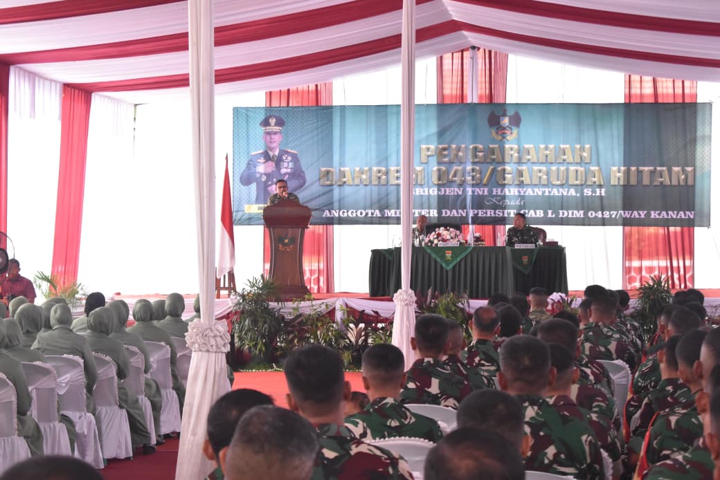 Dalam arahannya, Danrem 043/Gatam Brigjen TNI Haryantana menekankan beberapa poin penting yang harus dipedomani dan dilaksanakan oleh seluruh prajurit Kodim 0427/Way Kanan.