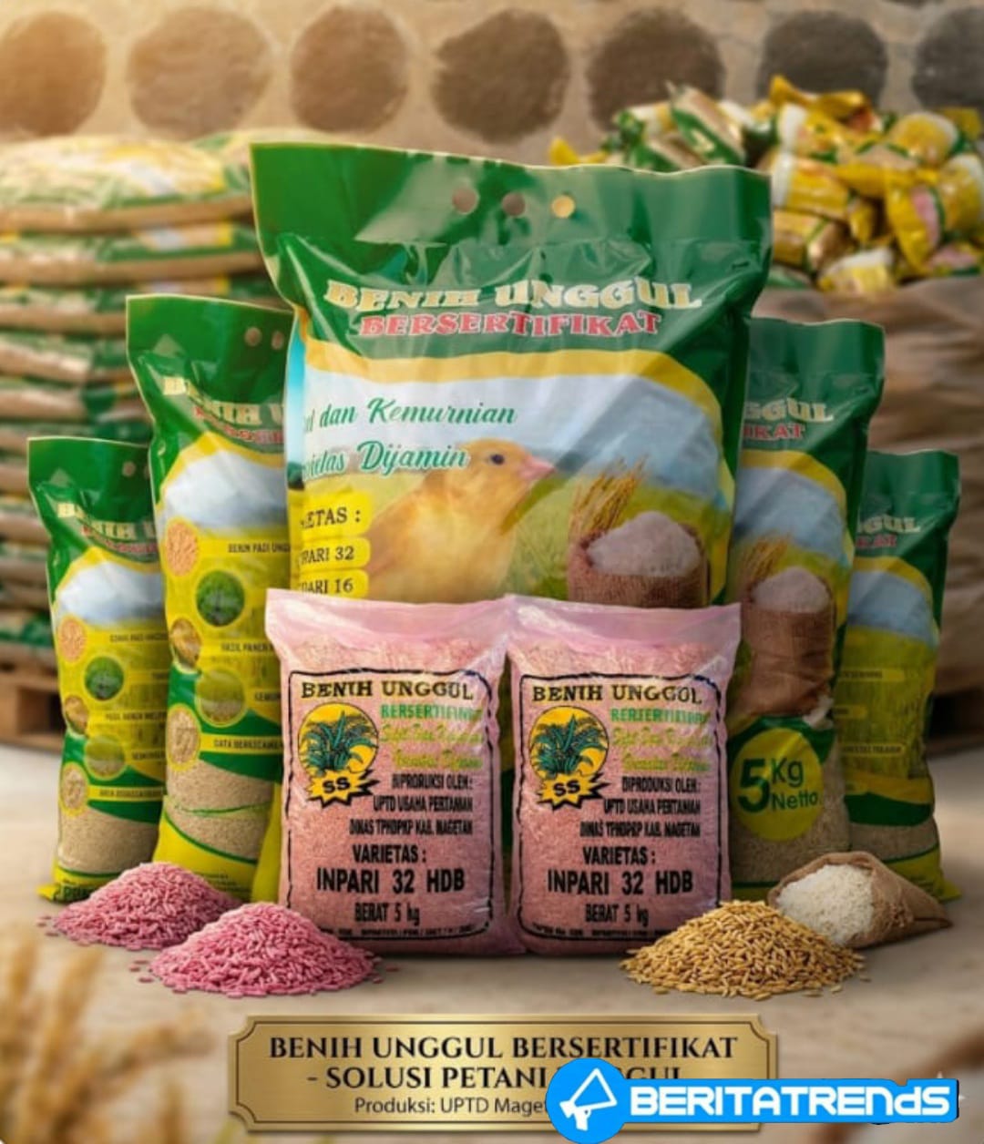 Beritatrends,Magetan – Dalam upaya mendukung peningkatan produksi dan ketahanan pangan daerah, Dinas Tanaman Pangan Hortikultura dan Perkebunan Kabupaten Magetan terus menghadirkan inovasi dan pelayanan terbaik bagi petani melalui penyediaan benih padi berkualitas premium dan non premium yang diproduksi secara selektif dan terstandar.
