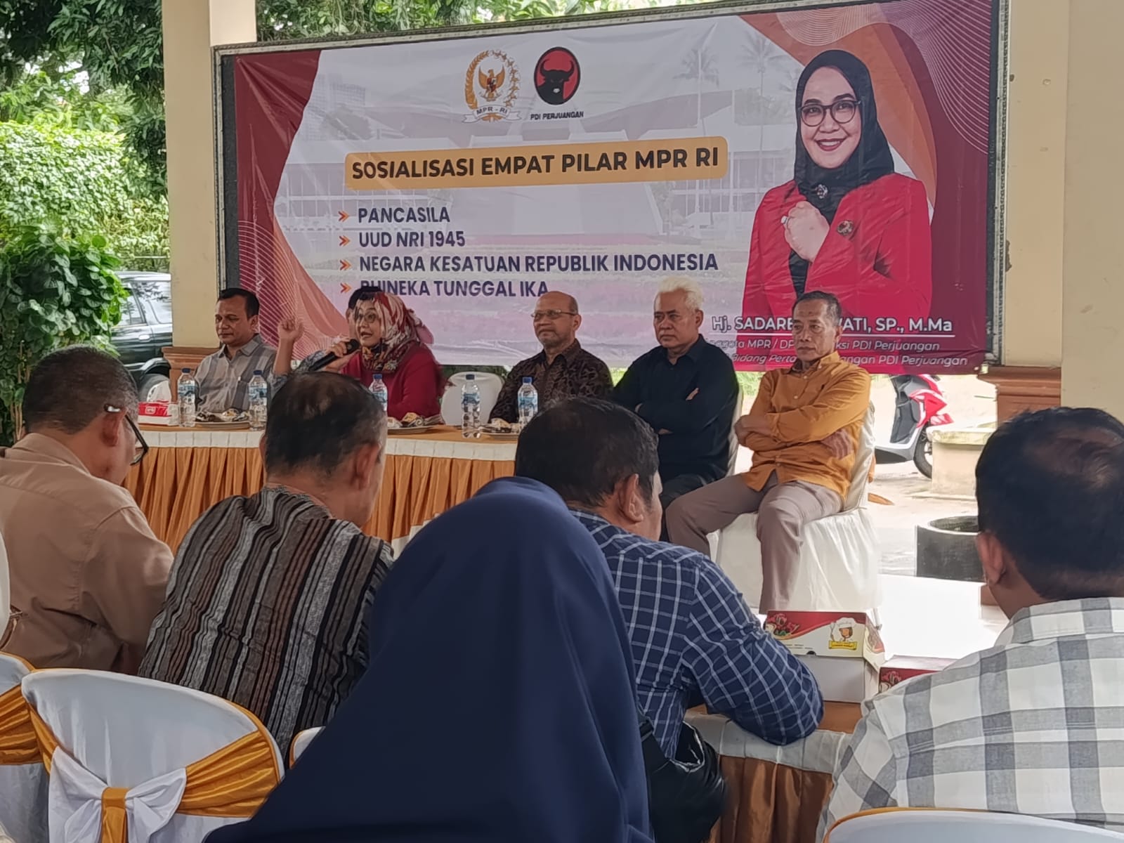 Anggota DPR RI Komisi IV Sadarestuwati didampingi Ketua DPRD Kabupaten Madiun Fery Sudarsono menyampaikan materi sosialisasi Empat Pilar Kebangsaan di Pendopo Kecamatan Mejayan, Kabupaten Madiun, Sabtu (7/2/2026).