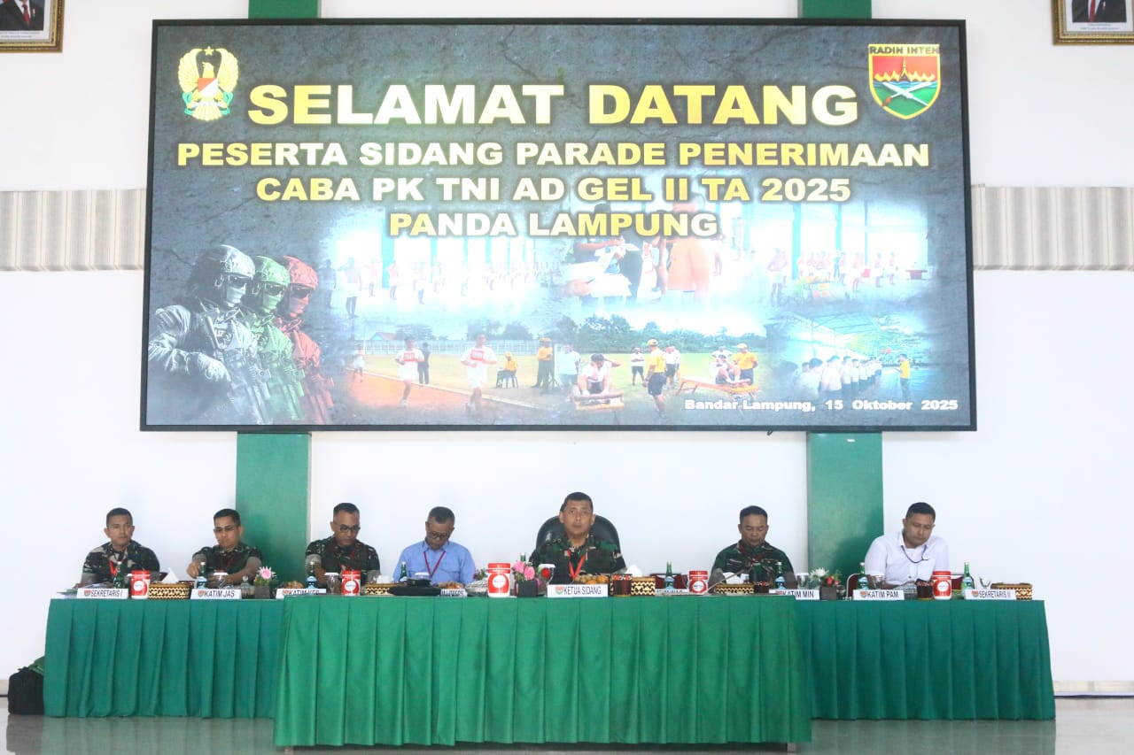 Beritatrends,Lampung – Kasdam XXI/Radin Inten, Brigjen TNI Andrian Susanto, S.I.P., M.Han., M.I.Pol., memimpin langsung Sidang Parade Penerimaan Calon Bintara (Caba) Prajurit Karier (PK) TNI AD Gelombang II TA 2025 Panda Lampung, yang digelar di Aula Sudirman Makodam XXI/Radin Inten, Jl. Teuku Umar, Penengahan, Bandar Lampung, Rabu (15/10/2025).