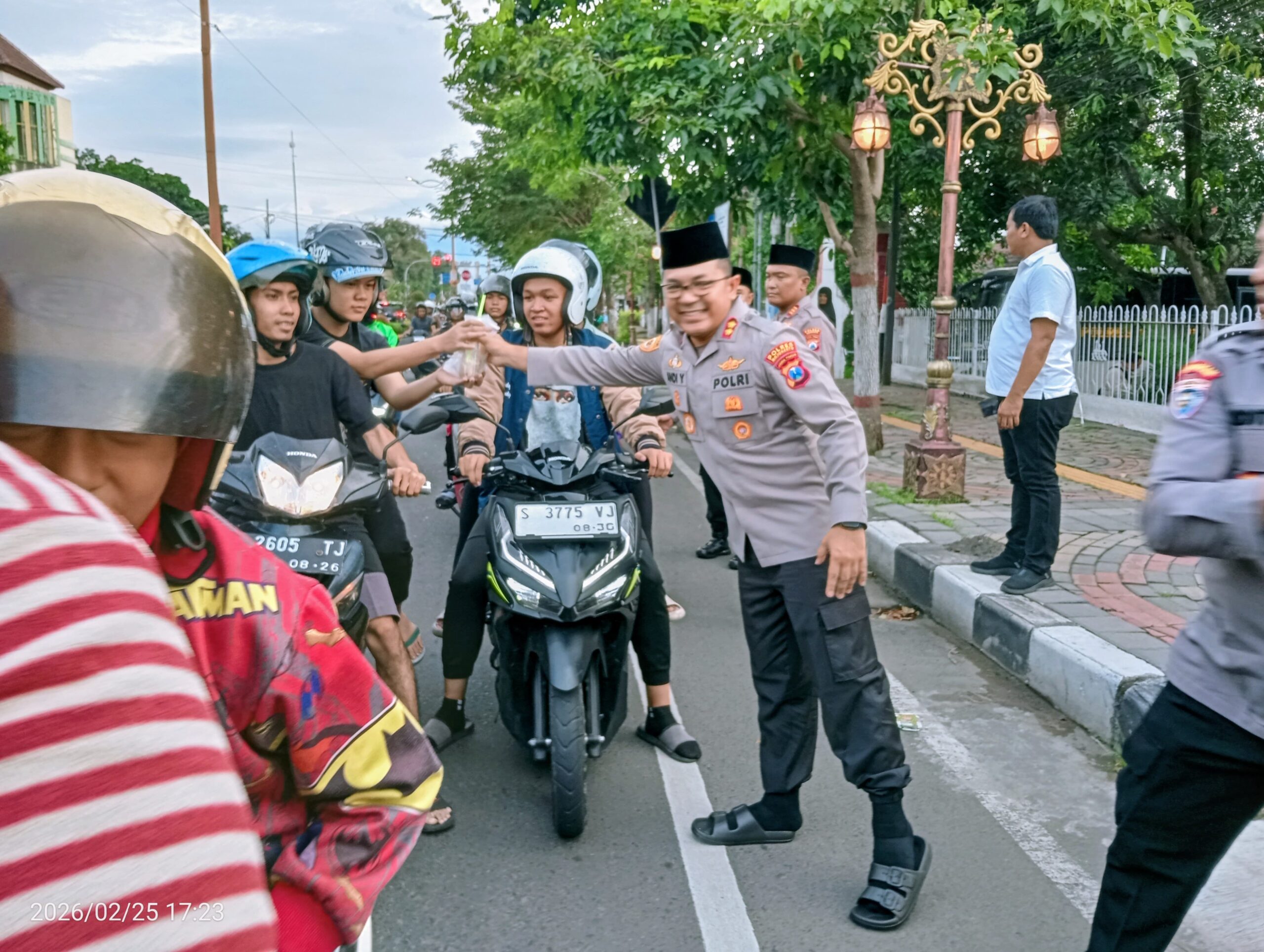 Tampak Kapolres Mojokerto AKBP Andi Yuda Pratama bersama awak media membagikan takjil kepada penguna jalan