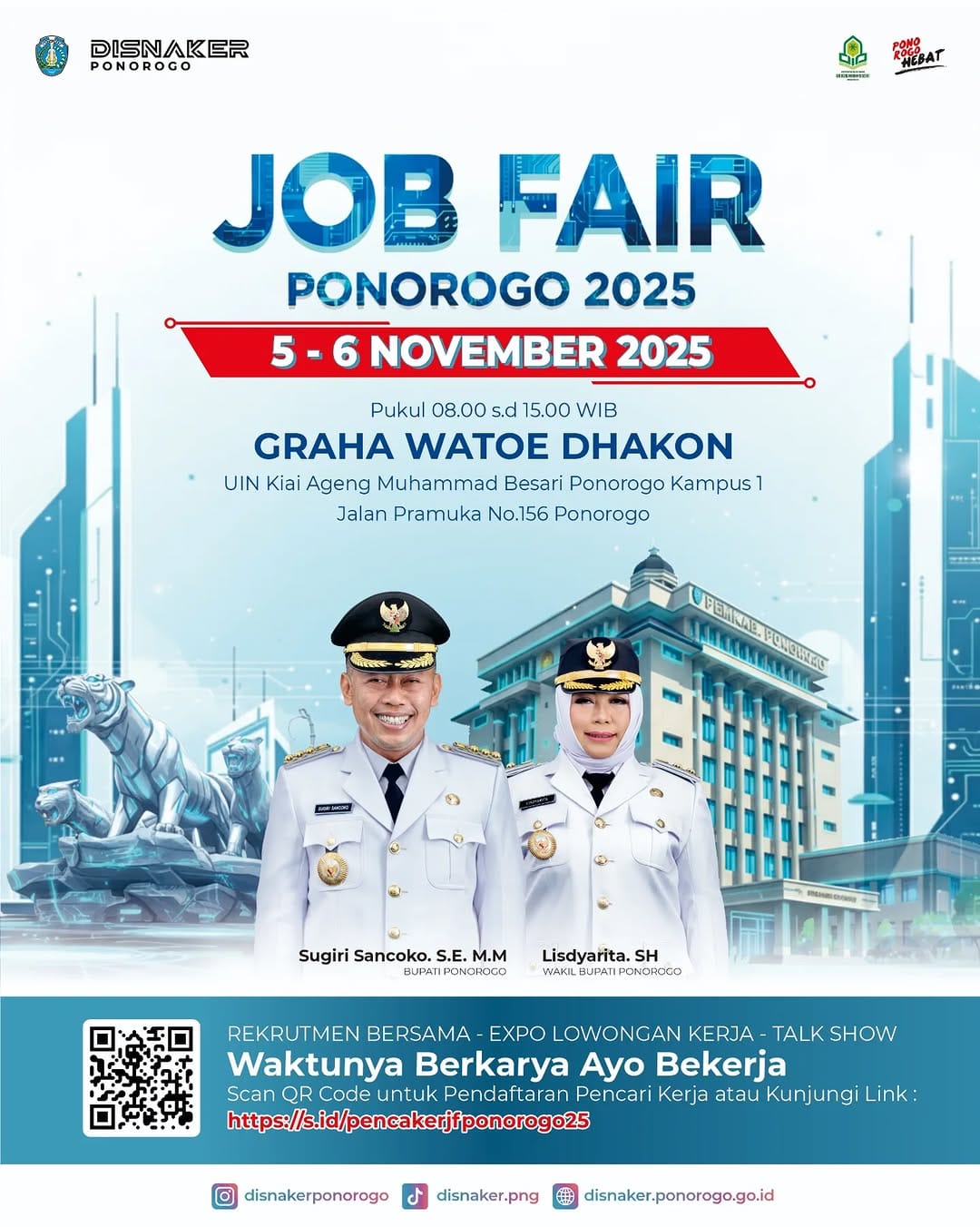 Beritatrends,Ponorogo – Kabar gembira bagi para pencari kerja di Ponorogo. Pemerintah Kabupaten Ponorogo melalui Dinas Tenaga Kerja (Disnaker) menggelar Job Fair 2025 pada Rabu dan Kamis, 5–6 November.