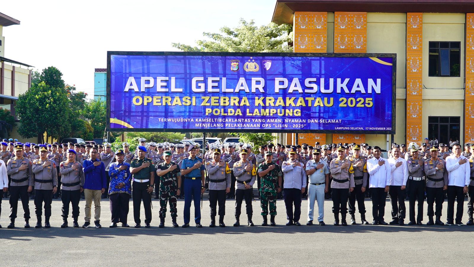 Beritatrends,Lampung Selatan – Kasdam XXI/Radin Inten Brigjen TNI Andrian Susanto, S.I.P., M.Han., M.I.Pol., menghadiri Apel Gelar Pasukan Operasi Zebra Krakatau 2025 yang berlangsung di Lapangan Apel Polda Lampung, Jalan Terusan Ryacudu, Way Huwi, Jati Agung, Lampung Selatan, Senin (17/11/2025). Tahun ini kegiatan mengusung tema “Terwujudnya Kamseltibcar Lantas yang Aman, Nyaman, dan Selamat Menjelang Pelaksanaan Ops Lilin 2025”.