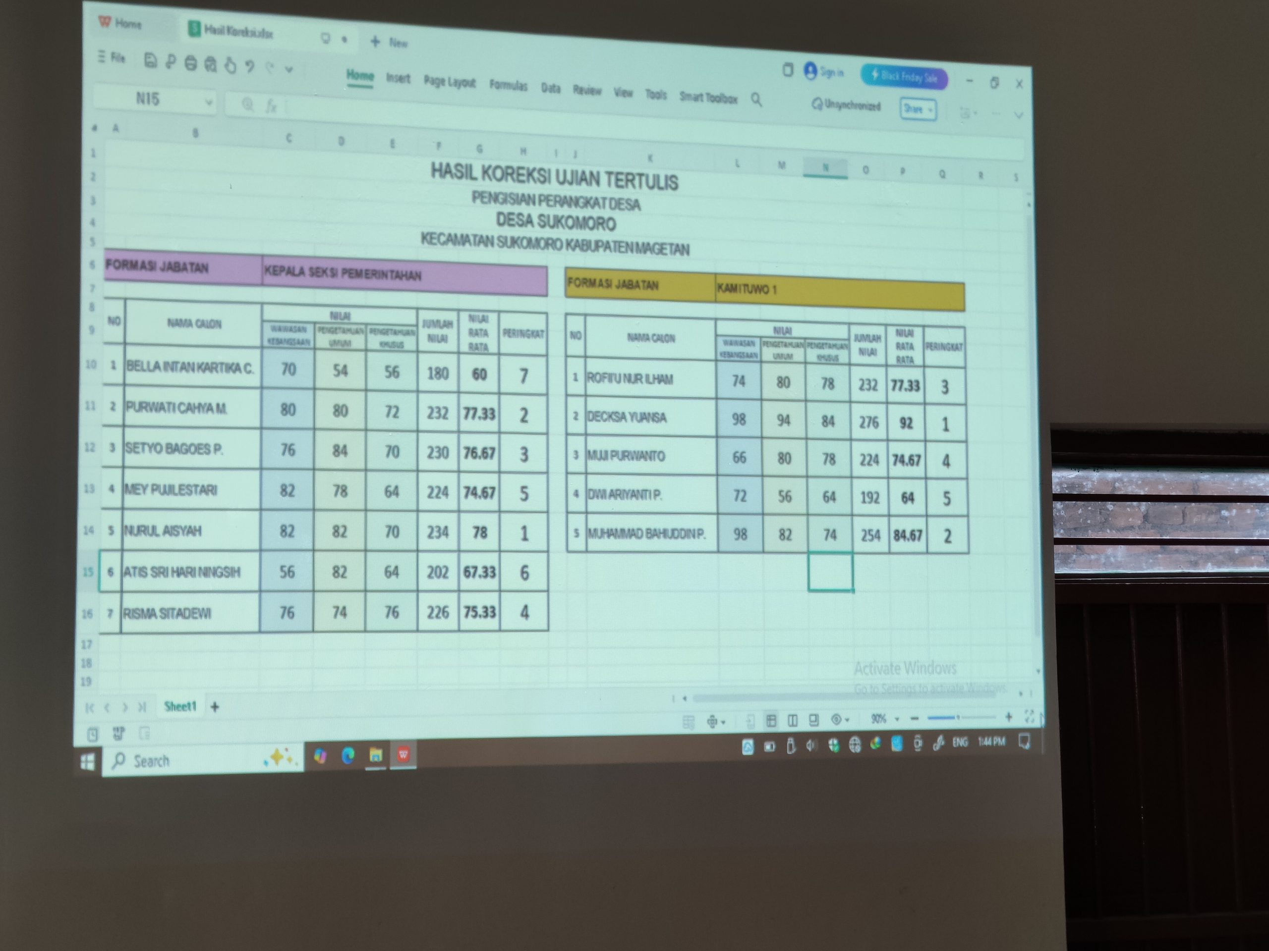 Dari formasi kepala seksi Pemerintahan ada Nurul Aisyah dengan nilai rata-rata 78.dan dari formasi Kamituwo 1 ada Decsa Yuansa dengan nilai rata-rata 92.