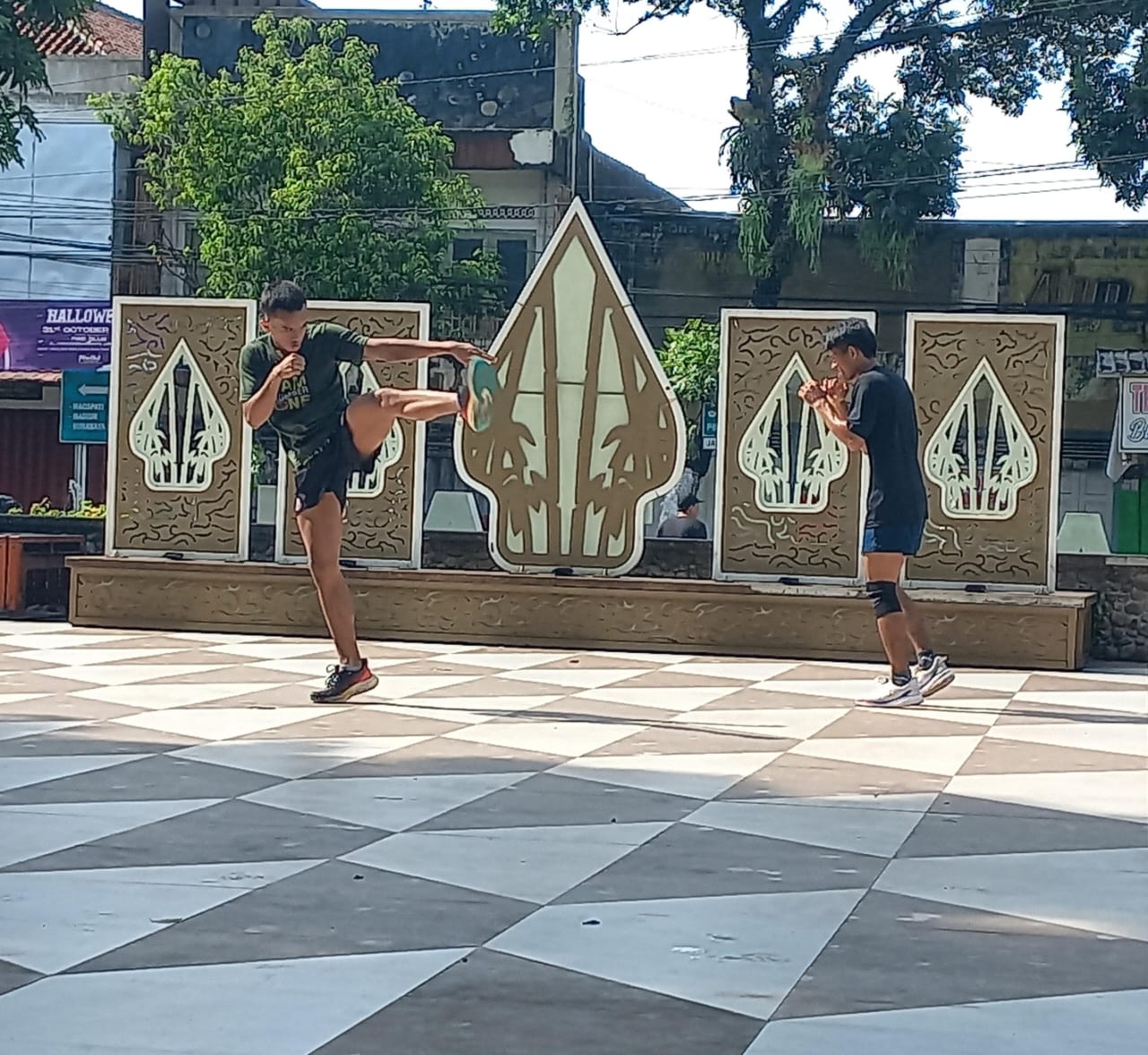 Atlet MMA dan Muaythai Magetan saat latihan di depan Foodcord Pasar Baru