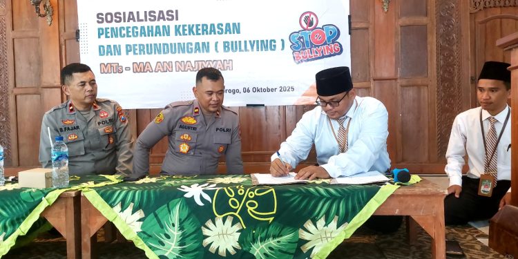 Beritatrends,Ponorogo – Polsek Sukorejo menggelar kegiatan penyuluhan dan sosialisasi tentang bahaya bullying di Pondok Pesantren Annajiyah, Desa Lengkong, Kecamatan Sukorejo, Kabupaten Ponorogo, pada Selasa, 7 Oktober 2025.