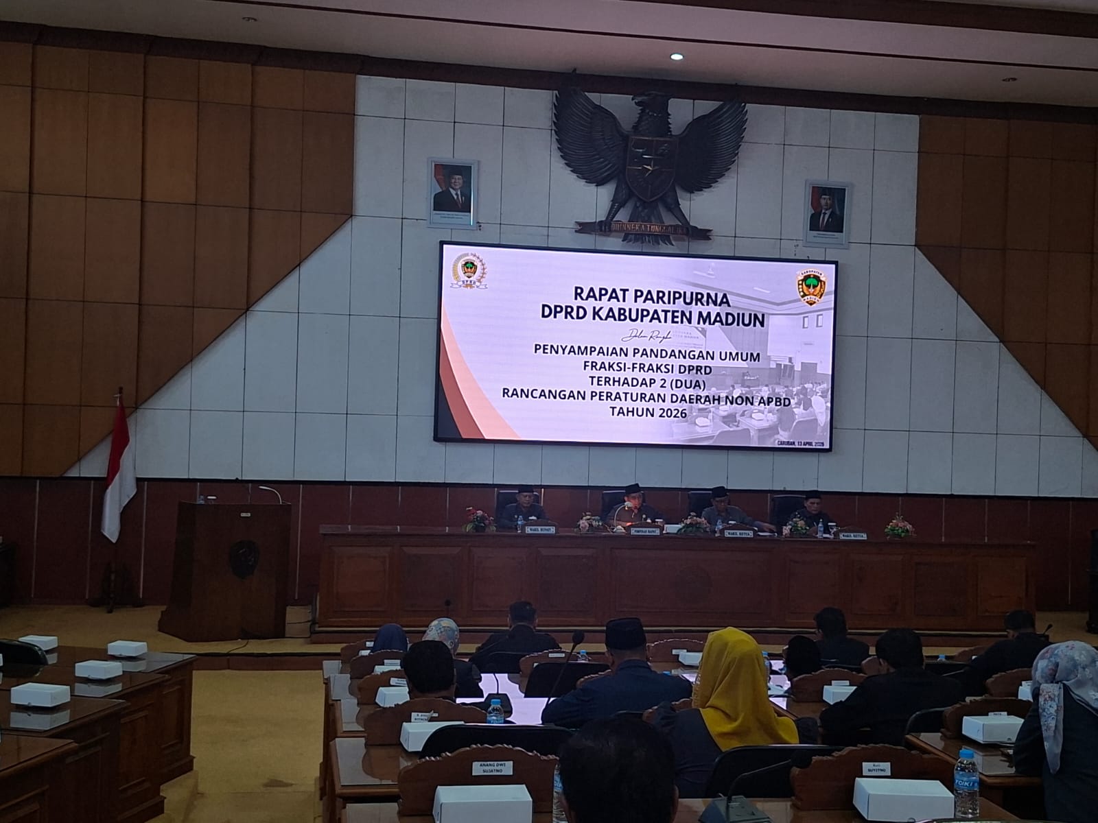 RAPAT PARIPURNA—Dewan Perwakilan Rakyat Daerah (DPRD) Kabupaten Madiun menggelar rapat paripurna dengan agenda pembacaan pandangan umum terhadap Dua Rancangan Peraturan Daerah (Raperda) non-APBD, Senin (13/4/2026).