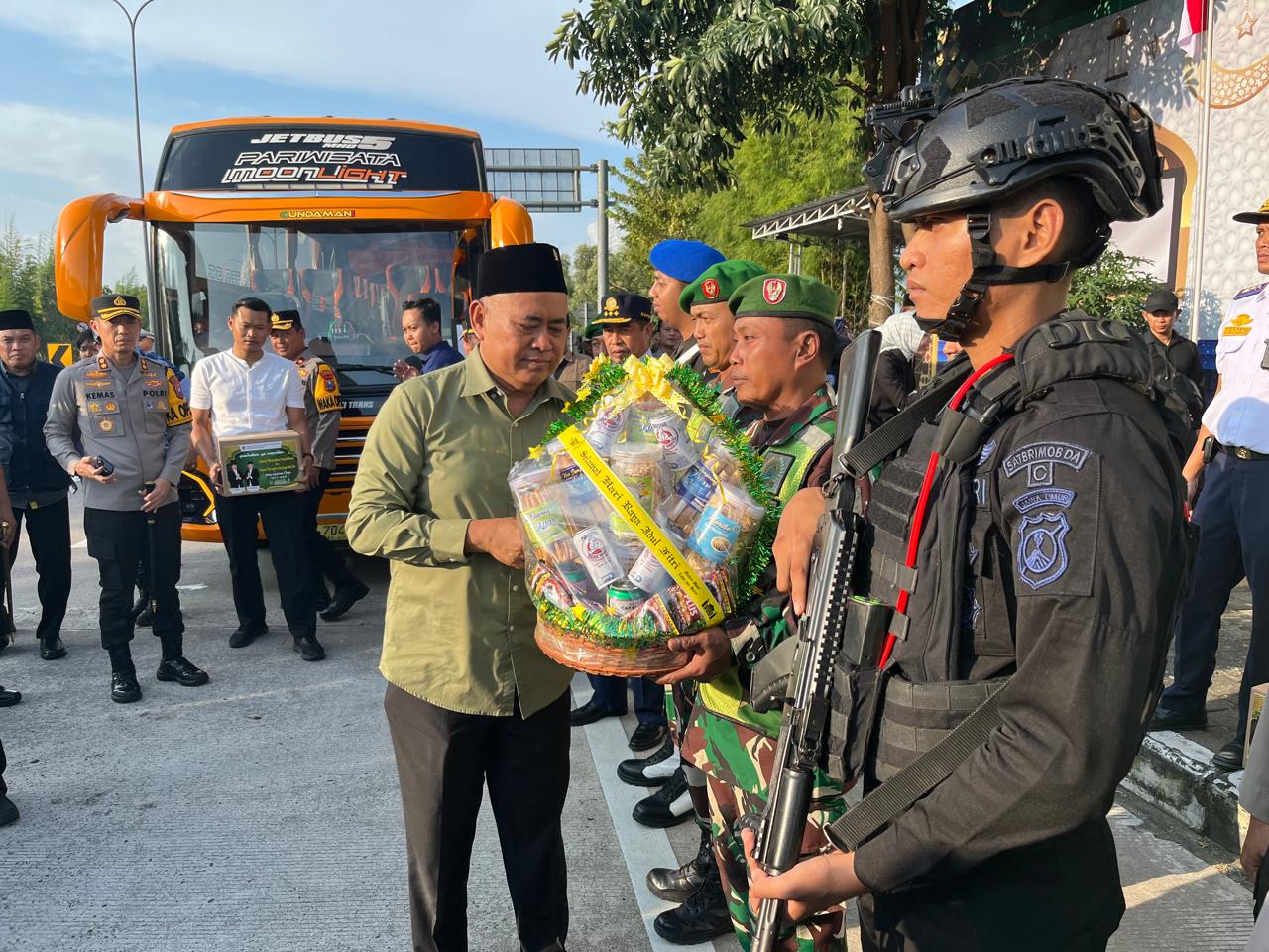 SERAHKAN BINGKISAN—Ketua DPRD Kabupaten Madiun, Fery Sudarsono memberikan bingkisan lebaran bagi petugas di Pospam Terpadu Exit Tol Dumpil Kabupaten Madiun, Jawa Timur, Jumat (13/3/2026).
